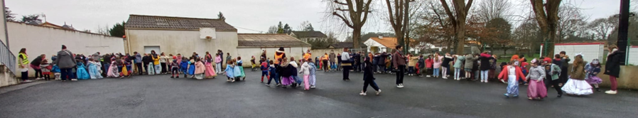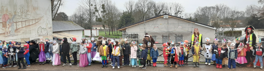 Les élèves de PS, MS, GS et CP ont participé à un carnaval pour célébrer Mardi Gras. Pour l’occasion, ils se sont tous déguisés et ont défilé en musique dans les rues de la Planche. Ils sont également allés voir les CE et CM dans leur école afin de partager ce moment tous ensemble.